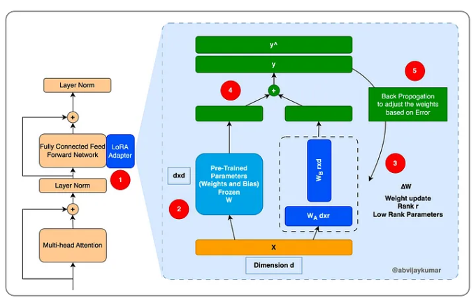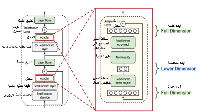 هي طريقةٌ تقوم بإضافة طبقتين للنّموذج المدرّب مسبقًا _كما هو موضّحٌ بالشّكل (1)_ وهما طبقتان من المعدّل تُضاف إلى بنية المحوّل transformer. أوزان هاتين الطّبقتين سوف يتمّ تعديلها وفقًا للمهمّة المحدّدة مع عدم إجراء أيّ تعديلٍ في الأوزان الأصليّة، وبالتّالي كلّ نسخةٍ يتمّ ضبطها بدقّةٍ Finetuned من النّموذج سوف تحتوي فقط على عددٍ محدودٍ من المعاملات المرتبطة بالمهمّة المحدّدة، ممّا يجعلها أكثر كفاءة من حيث الحجم والتّخزين. [3]