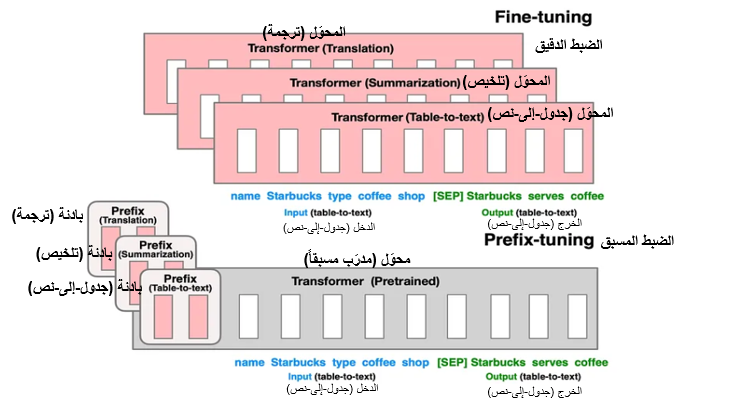 يوضح الشكل (2) كيف يتطلب الضبط الدقيق Fine-tuning تدريب نموذج منفصل لكل مهمة (مثل الترجمة، التلخيص وتحويل الجدول إلى نص)، بينما في الضبط المسبق Prefix-tuning نحتفظ بنموذج واحد مسبق التدريب مع بادئات مخصصة لكل مهمة.
