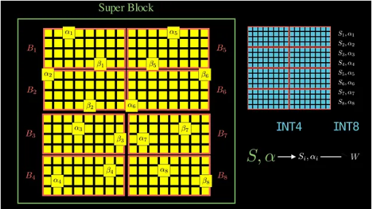 تُقسَّم مصفوفة الأوزان Super Block إلى بلوكات فرعية تضم عادةً 32 أو 64 وزنًا، وغالبًا ما يكون عددها 8 (B1–B8) ويُحسَب لكل بلوك حدّان هما (الأدنى) و (الأعلى) لاشتقاق معامل التحجيم الخاص به. تُكمَّم الأوزان داخل كل بلوك بتمثيل صحيح 4 بت، بينما تُكمَّم قيمتا و بتمثيل صحيح 8 بت للحفاظ على دقة فك التكميم. كما تعتمد الطريقة دقّةً مختلطة؛ إذ تُحفظ المكوّنات الجوهرية مثل طبقات التَّطبيع Layer Norms وآليّات الاهتمام Attention Mechanisms بتمثيل عائم، وتُكمَّم بقية الأوزان، ويُشار إلى هذا الأسلوب بالصيغة Qm_K_M.