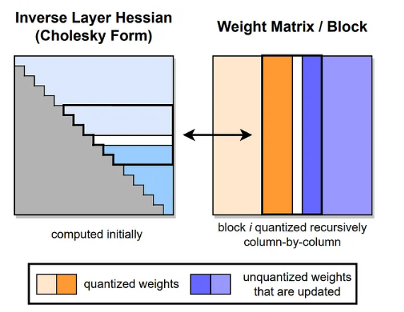 ثانيًا: آليّة العمل الداخليّة: تبدأ العملية بتمرير مجموعةٍ محدودةٍ من بيانات المعايرة عبر الطبقة المستهدفة لتسجيل المدخلات وتقدير أثر التكميم، ثم تُستخدم المعايرة لاشتقاق نطاقات القيم ومعاملات التكميم للأوزان (وأحيانًا للتفعيلات) اعتمادًا على بيانات تمثيلية قريبة من توزيع بيانات الاستدلال، بعد ذلك تُقدَّر حساسية الطبقة عبر المصفوفة الهيسيانية العكسية Inverse Hessian التي تعبّر عن مدى تأثر الخسارة بتغيّرات الأوزان؛ وتُعد الأوزان المرتبطة بقيم أصغر فيها أكثر أهمية، يُنفَّذ التكميم بصورة متسلسلة وزنًا بعد وزن: يُكمَّم الوزن ثم يُلغى تكميمه للعودة إلى المجال العائم، ويُحسب خطأ التكميم الناتج ويُوزن بقيمة الهيسياني العكسي، ثم يُعاد توزيع الخطأ Error Compensation على بقية الأوزان في الصف نفسه لتعويض الانحراف وتقليل تراكمه. تتكرر هذه الخطوات عبر أوزان الصف ثم بقية الصفوف والطبقات حتى يكتمل تكميم النموذج.