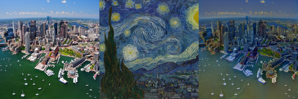 سنقوم في هذا المقال بإنشاء تأثيرات نقل نمط style transfer مميّزة، وللقيام بذلك يتوجّب علينا فهم كيفيّة عمل شبكات الطّيّ العصبونيّة وطبقاتها بشكل أعمق. بعد الانتهاء من قراءة هذا المقال ستتمكن _عزيزي القارئ _ من إنشاء تطبيقات نقل نمط قادرة على تطبيق نمطٍ جديد على الصّورة، مع الحفاظ على محتواها الأصليّ كما في مثال صورة سماء مدينة بوسطن المذكور أعلاه والموضّح في الشكل (1).